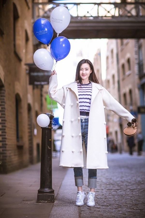 尤为引人注目的是,王丽坤手中轻轻牵着的几只蓝色与白色气球。这些跳跃的气球仿佛被注入了灵魂,成为整组写真的点睛之笔。它们打破了古老街道的沉静,为王丽坤的周身增添了一抹灵动俏皮的色彩。当她手持气球,或伫立凝望,或翩然行走时,仿佛一位从童话故事中走出的女孩,美好韶光就在她轻盈的脚步与飞扬的裙摆间悄然定格。这巧妙的一笔,将青春的活力与老街的历史光影完美地串联起来,动静结合,意境悠远。