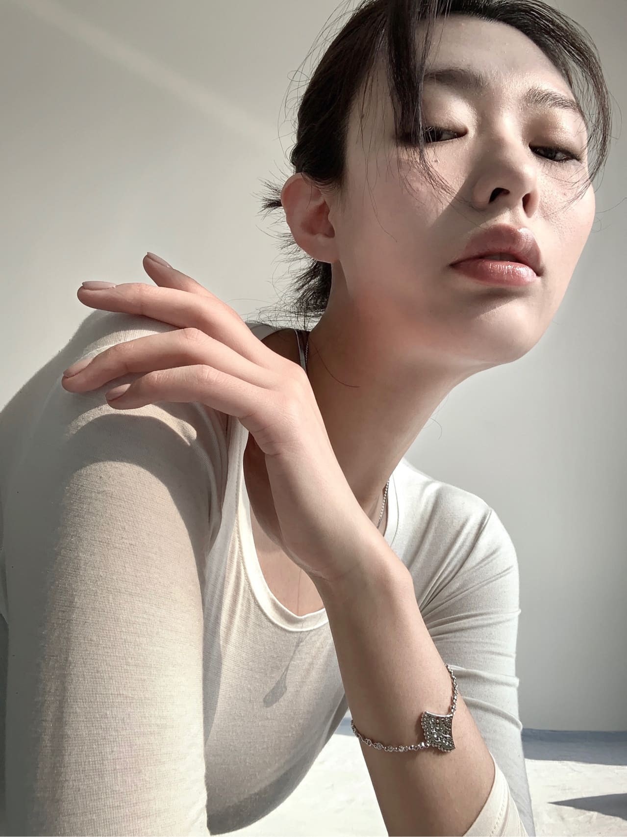 镜头前的女性撩发浅笑,健康的光泽肌肤与自然微张的厚唇,散发着阳光而活力的气息