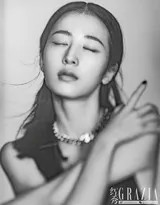 具体到这组写真的造型,每一套都堪称匠心独运。最为吸睛的莫过于那条黑色吊带长裙。细如丝线的肩带轻巧地勾勒出优越的肩颈线条,收腰设计将玲珑曲线展现得淋漓尽致,而哑光质地的黑色面料则如同静谧的深夜,散发出神秘而高级的气息。珍珠项链的加入是点睛之笔,温润的光泽与黑色的深邃形成美妙对比,平添一份优雅与贵气。另一套黑色露肩上衣与阔腿裤的组合,则展现了截然不同的风格。它摒弃了裙装的柔媚,以利落的线条和简约的黑调,勾勒出都市女性干练、飒爽的一面。她或倚靠墙面,或随意而坐,眼神清冷而自信,将那份不羁与洒脱拿捏得恰到好处。