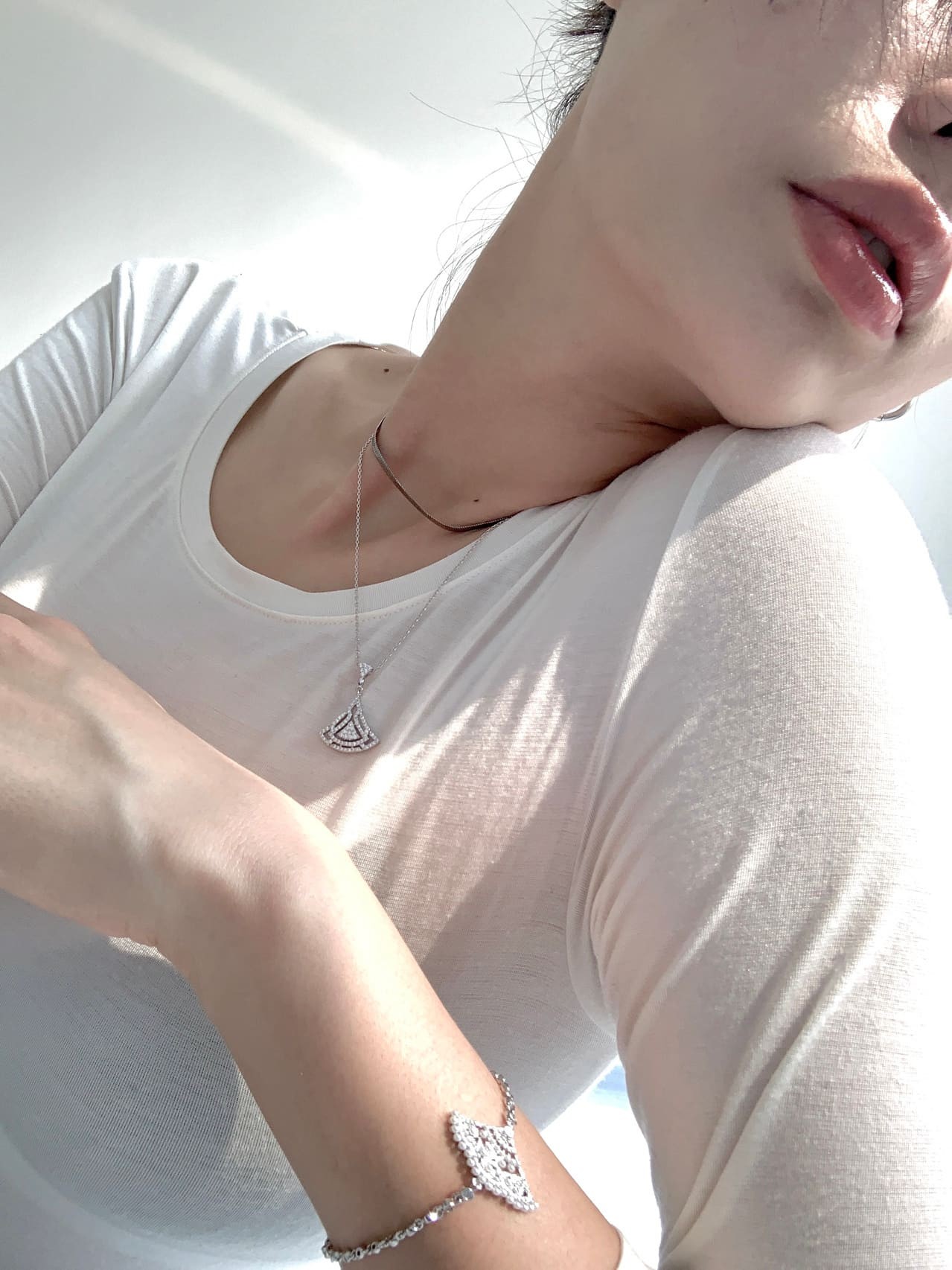郑爽身着浅色系服装倚靠窗前,自然光线勾勒出其柔美侧脸与宁静氛围