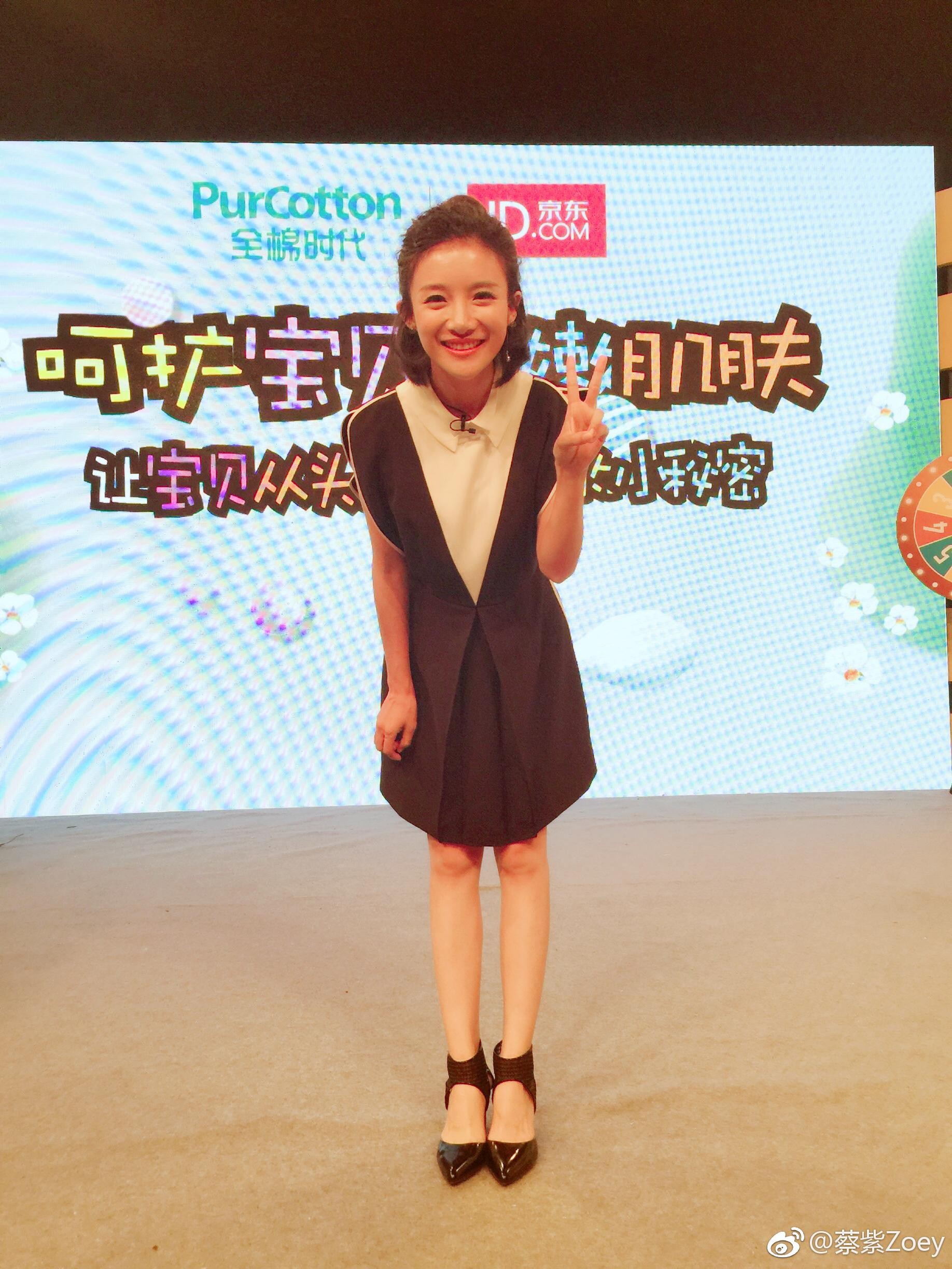 舞台中央蔡紫从容站立,聚光灯下全身造型清晰展现,诠释现代主持人的时尚职业风范